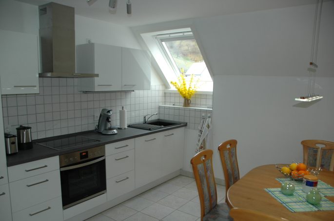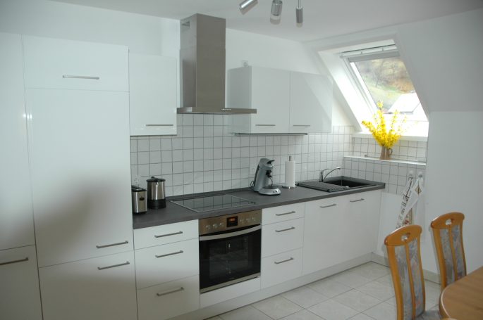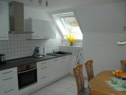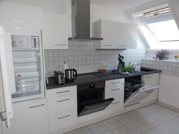 Die moderne Einbauküche ist voll ausgestattet mit Kühlschrank incl. Gefrierfach, Herd mit Backofen, Geschirrspüler. Zusätzlich gibt es eine Microwelle, Wasserkocher, Toaster, Senseo-Kaffeemaschine. Alles was an Geschirr, Gläser oder Besteck gebraucht wird, ist vorhanden.